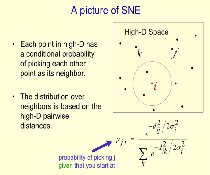 下图为 SNE 的示意图,其中高维空间的每个点都有选择其他点作为其邻域的条件概率,并且邻域分布基于高维成对距离(pairwise distance)。