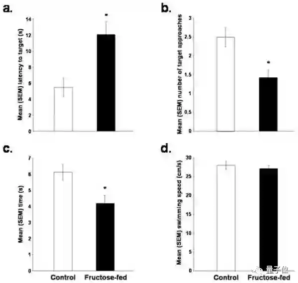 在游泳速度都相当的情况下,高果糖摄入小鼠到达目标平台的平均时间要更久一些,且接近目标的次数也没有对照组多,用时也会更久一些。