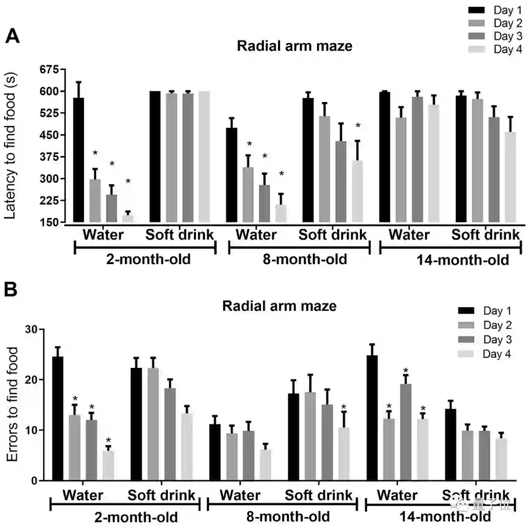 发现长期摄入可乐的小鼠组会有不同程度的记忆障碍,这个记忆障碍的程度还和年龄有关。