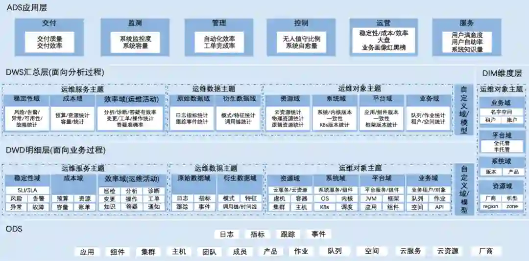 一套数据化运维体系,会把所有系统的运维数据全部采集起来、真正打通,并深度挖掘这些数据的价值,为运维提供数据决策;同时构建数据化运维业务模型,基于该模型建立标准化运维数仓,建设数据运维平台,在平台中规范运维数据的采集、存储、计算及分析,并提供一系列数据化服务,供上层运维场景使用。
