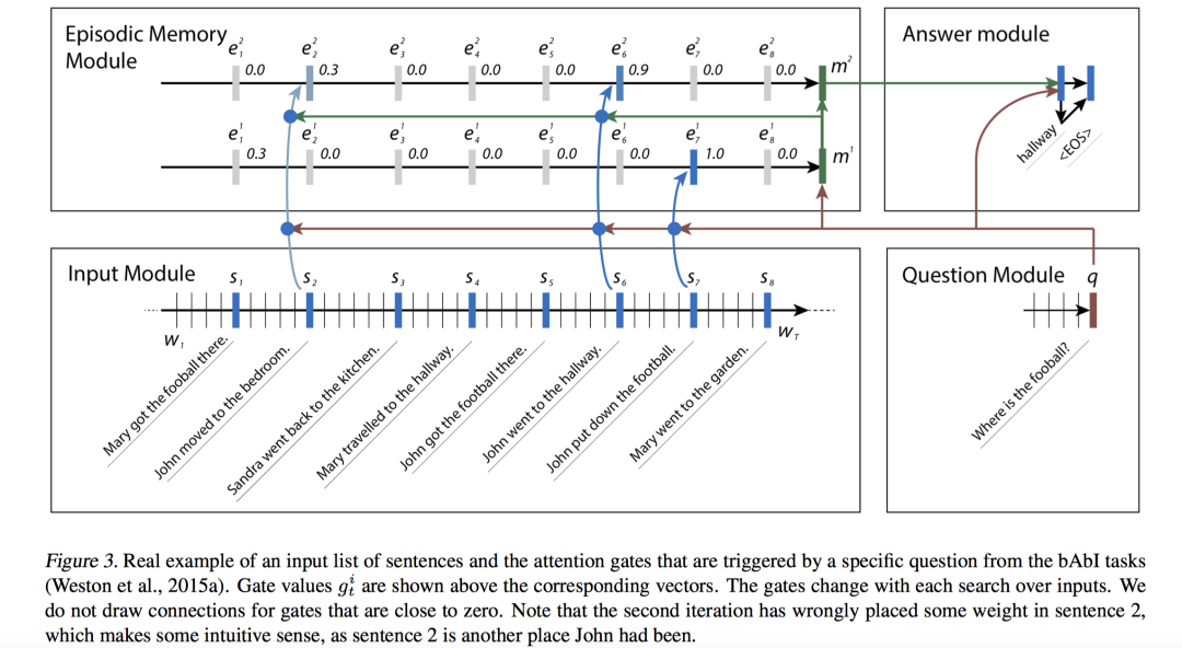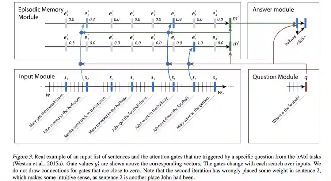 Episodic Memory Module场景向量 用于压缩和抽象输入序列,相当于将输入序列状态集合压缩并抽象成一个场景描述向量 ,这个场景描述向量是和「具体问题」以及「具体输入」都是相关的。为了计算场景向量,该模块维护了自己的隐状态 ,根据融合了Attention机制的第一个公式来计算;第二个公式表明,最后一个时刻得到的隐状态作为提取到的新场景 ;第三个公式再根据提取到的新场景和前一次迭代得到的记忆「更新记忆」。