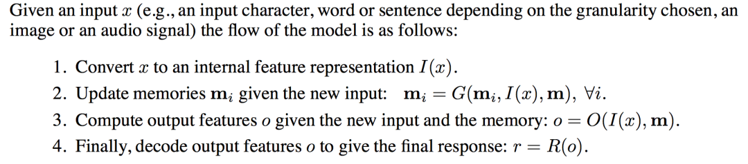 这篇文章的贡献在于提出了一种普适性的模型架构memory networks。其核心组件包括4部分: