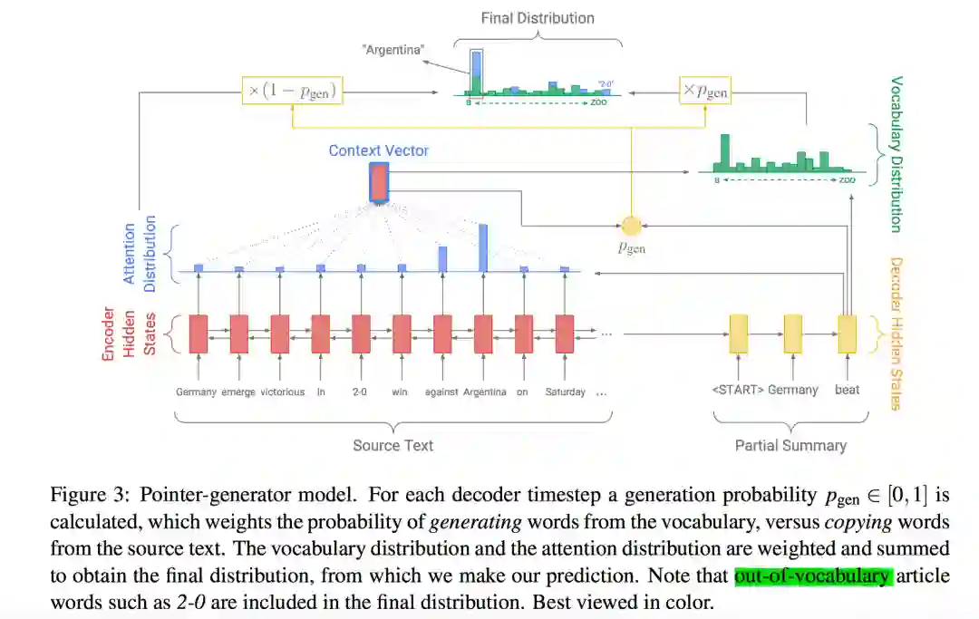 当然,直接这样操作未必会有好的结果,因此作者又加入了一个 来作为soft概率。Pgen的作用可以这样理解:决定当前预测是直接从源文本中复制一个词过来还是从词汇表中生成一个词出来,二者通过插值combine起来。