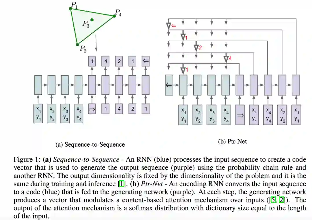 首先是“NIPS2015:Pointer Network“。作者想解决的是「输出序列语句中每个元素是离散的单词,且该元素和输入序列语句中每个位置相对应」的应用场景(an output sequence with elements that are discrete tokens corresponding to positions in an input sequence,说白了就是拷贝),如寻找凸包(比如训练的时候最多4个顶点,后来遇到10个顶点的几何图形就解决不了了)等。