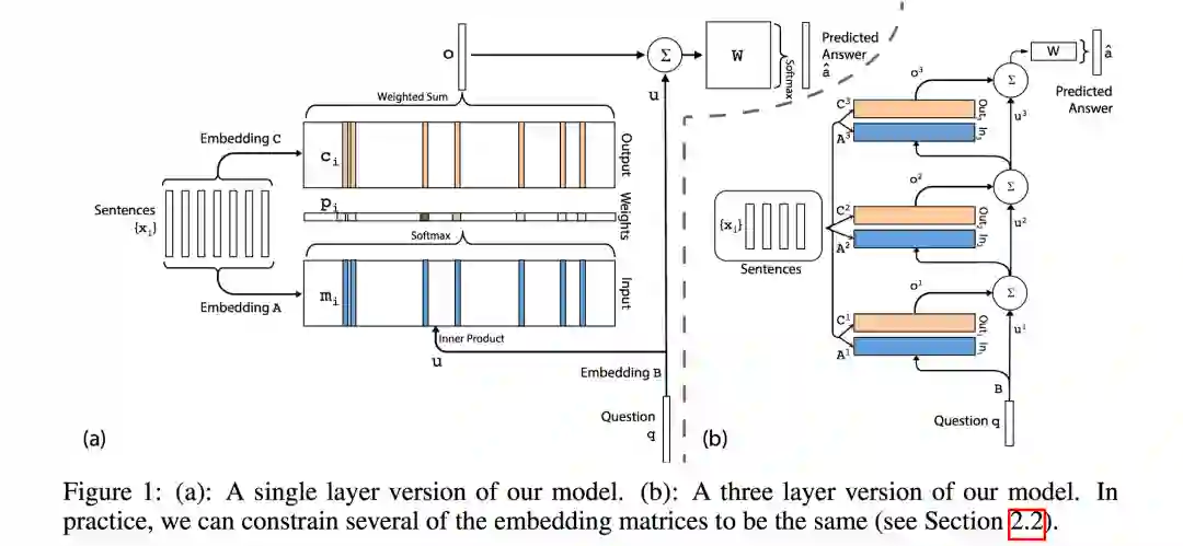 上图左侧(a)是单层的网络结构。最左边的就是memory,里面存储着输入集合 ,每个 代表一个句子。memory的输入和输出不同,按照我的理解memory的输入是key,输出是value。输入key用于计算和查询的相似性,输出value用于计算上下文向量。