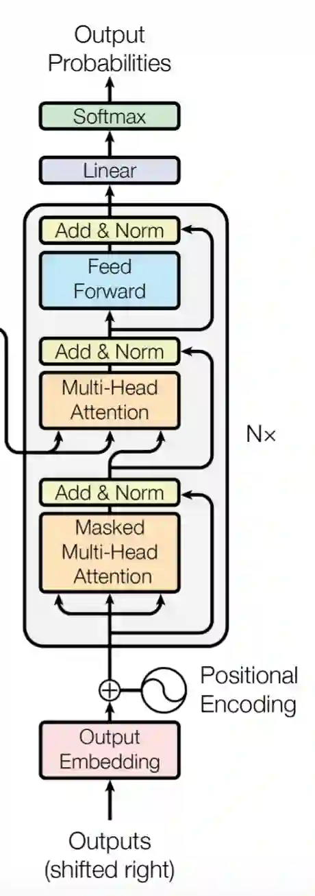 「已经翻译出的」目标词word embedding+position embedding。结构同encoder中的输入层,每个单词embedding维度为 ,假设已经翻译了 个词,则输入为矩阵 。