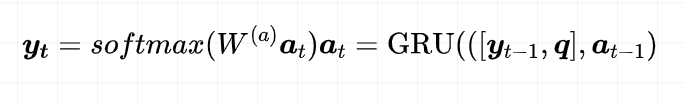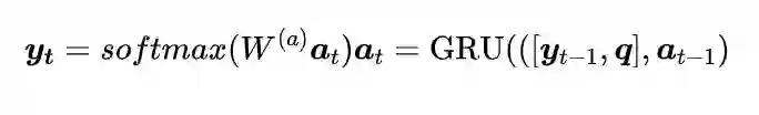 Answer Module:采用GRU。将上述提取到的最后一次迭代的记忆 作为初始隐状态,问题 和前一时刻预测的输出 作为输入,得到当前时刻的隐状态 ,接一个softmax全连接层得到该时刻输出词的概率分布。