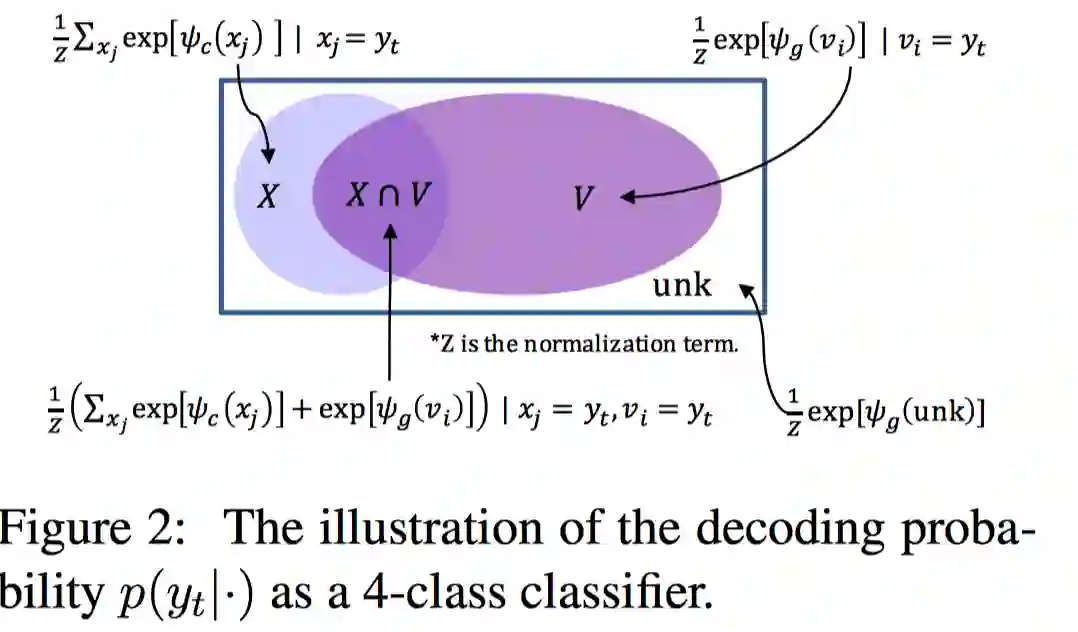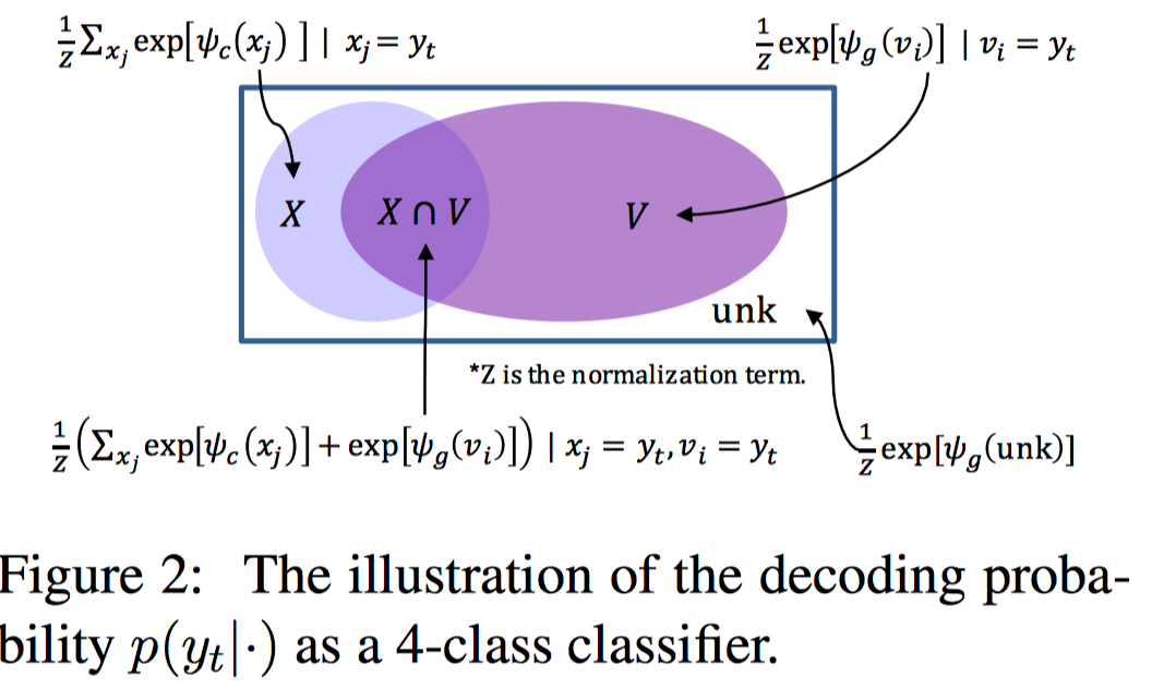 图中, 是源序列输入词; 是词汇表的词;unk是未知词。某个输出词可能属于上述4种情况中的一种。