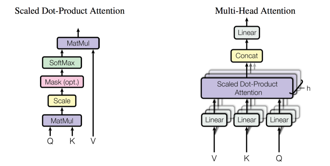 源语句的self attention。Multi-Head Attention如下图右边所示,每个Multi-Head Attention包含了 个Scaled Dot-Product Attention组件,也就是每个Head就是一个Scaled Dot-Product Attention组件,如下图左边所示。