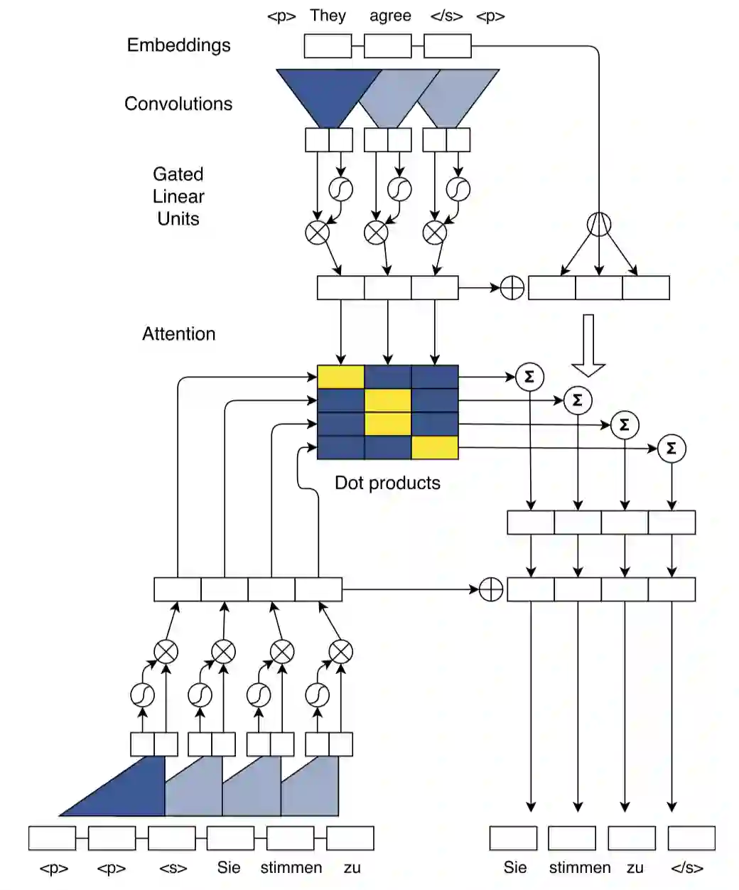如此,在Decoder每一个卷积层都会进行 attention 的操作,得到的结果输入到下一层卷积层,这就是多跳注意机制multi-hop attention。这样做的好处是使得模型在得到下一个注意力时,能够考虑到之前的已经注意过的词。