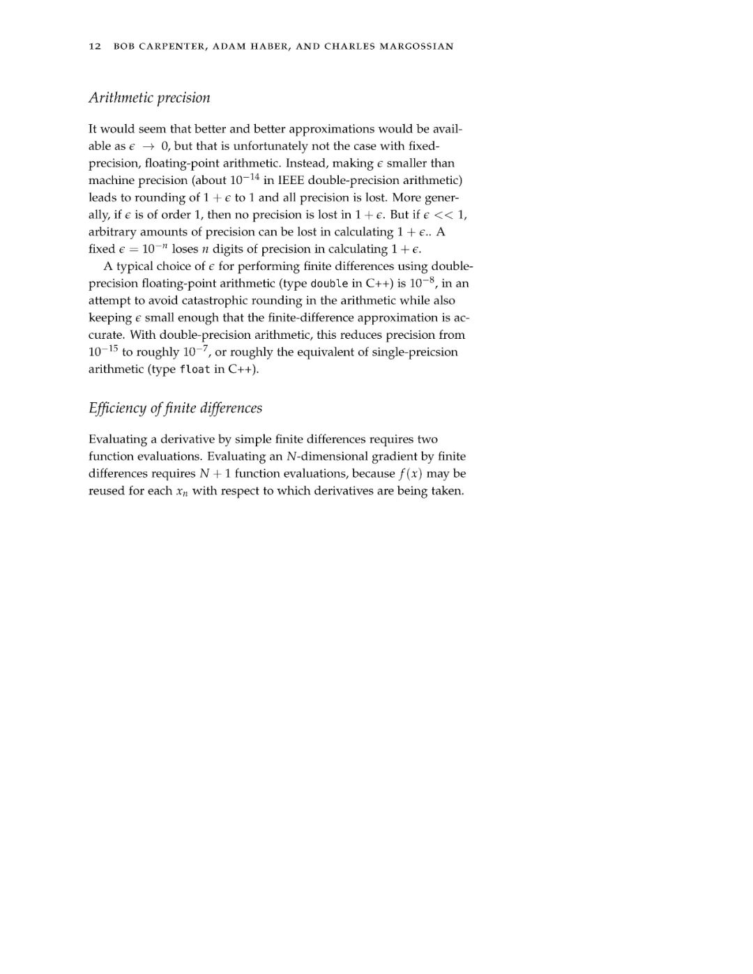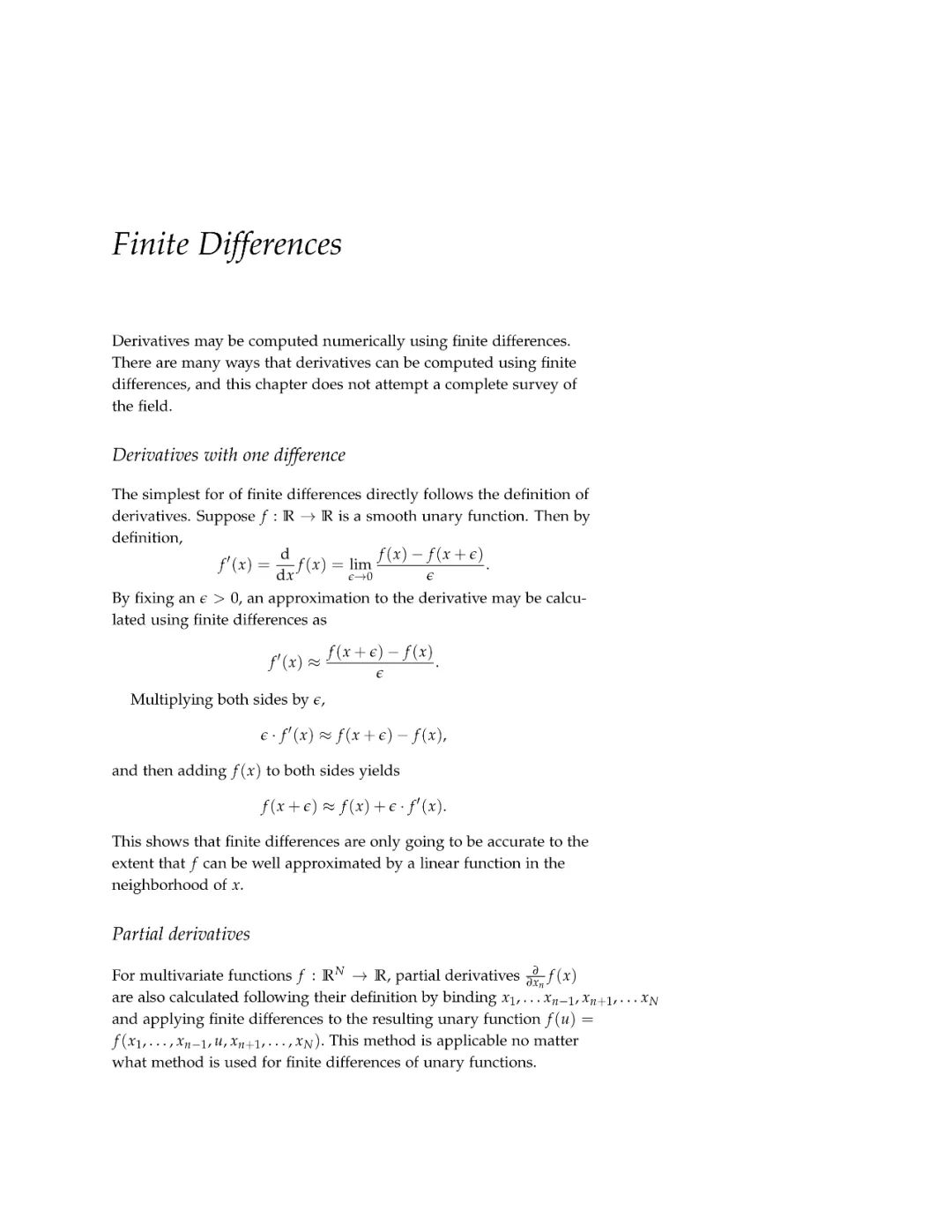 自动微分是一种通用的技术,用于将函数的计算值转换为可计算导数的值。导数计算只给用于计算函数值的每个操作增加一个常数的开销,因此可微函数与原始函数具有相同的复杂度阶数。在描述了自动微分的标准形式之后,这本书提供了一个百科全书收集的正切和伴随规则的前向模式和后向模式自动微分,涵盖了最广泛使用的标量,向量,矩阵和概率函数。附录包含正向模式、反向模式和混合模式自动区分的工作示例代码。