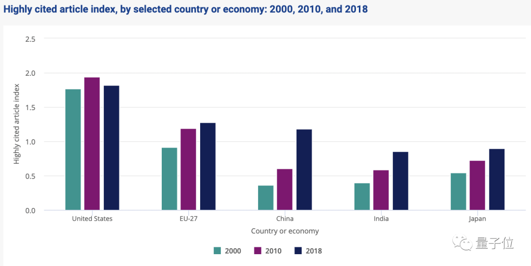 因此,NSF这份报告衡量的是高被引论文指数,也就是每个国家/地区在被引次数前1%科技出版物中所占份额与该国在所有科技出版物中的所占份额之比。