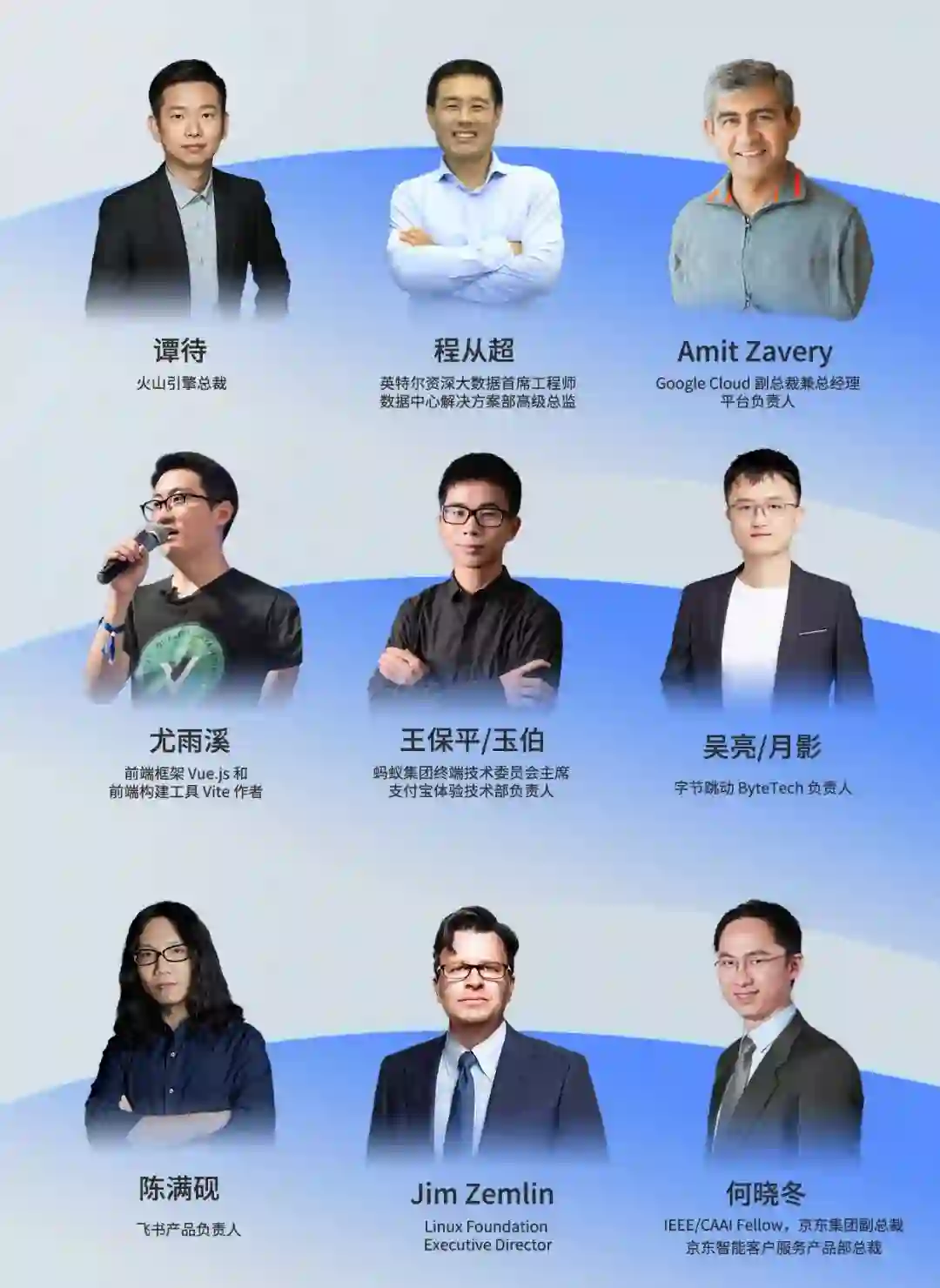 火山引擎总裁谭待为大会做了开场致辞并预祝大会圆满成功。英特尔资深大数据首席工程师、数据中心解决方案部高级总监程从超;Google Cloud 副总裁兼总经理、平台负责人 Amit Zavery;Linux Foundation 执行总裁 Jim Zemlin;IEEE/CAAI Fellow、京东集团副总裁、京东智能客户服务产品部总裁何晓冬;前端框架 Vue.js 和前端构建工具 Vite 作者尤雨溪;蚂蚁集团终端技术委员会主席、支付宝体验技术部负责人王保平(玉伯);字节跳动 ByteTech 负责人吴亮(月影);飞书产品负责人陈满砚等 9 位大咖嘉宾在大会主论坛上做了精彩的技术趋势、开源生态与产业发展的前沿分享,给万千开发者带来了一场知识堆栈溢出的盛会。