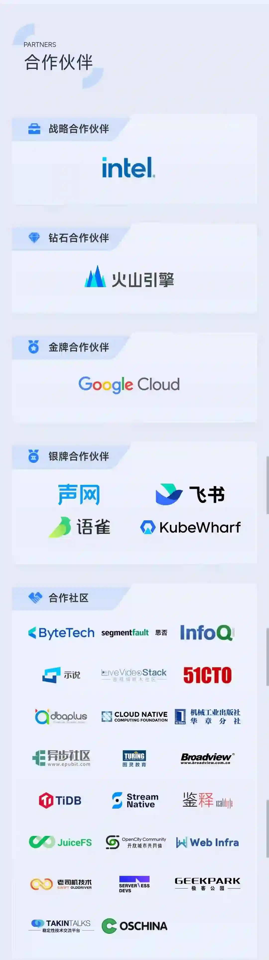 大会合作伙伴中,Intel、火山引擎、Google Cloud、声网、飞书、语雀、KubeWharf 等也都带来了精彩的分享,为与会者提供了不一样的视角与输入。