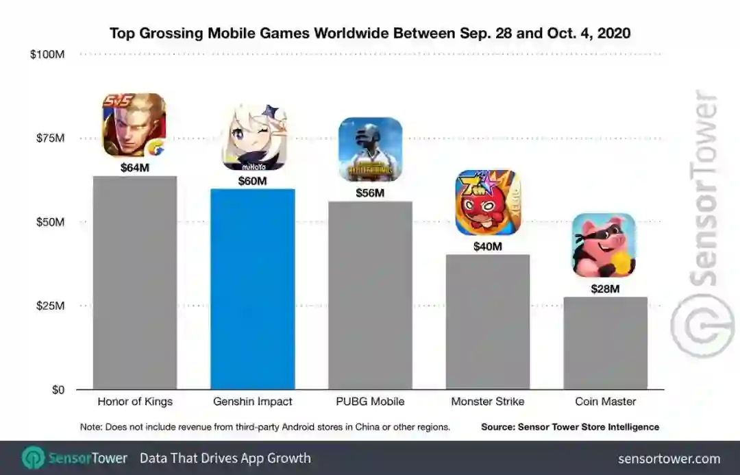 曾经饱受争议的《原神》终于于9月28日公测,在公测一周后,数据机构SensorTower公布了原神在9月28日到10月4日一周间的收入数据,已经达到了6000万美元,约合4亿人民币。