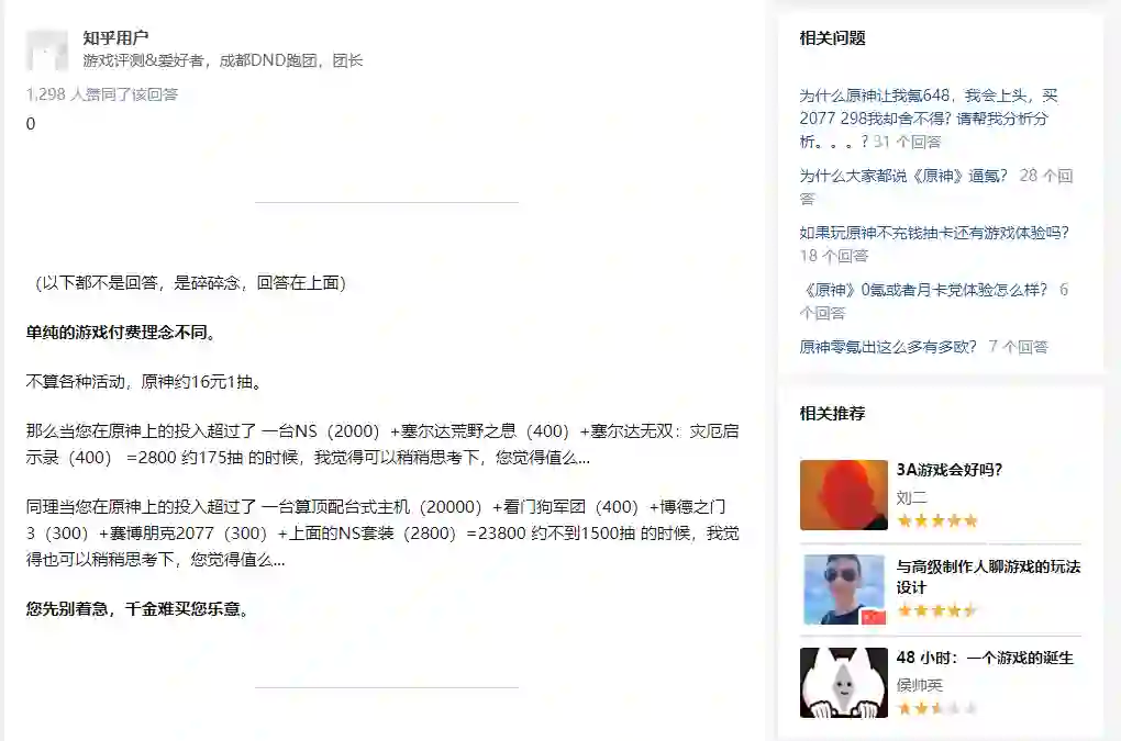 就像在知乎“你能接受给《原神》氪多少钱?”话题下,有玩家给原神算过帐,不算活动,《原神》约16元1抽, 而该答主将玩家们日常抽卡的标准换算成了游戏主机和3A大作,比如一台NS(2000)+塞尔达荒野之息(400)+塞尔达无双:灾厄启示录(400) =2800 约175抽,175抽只能抽出《原神》的一个保底五星角色。
