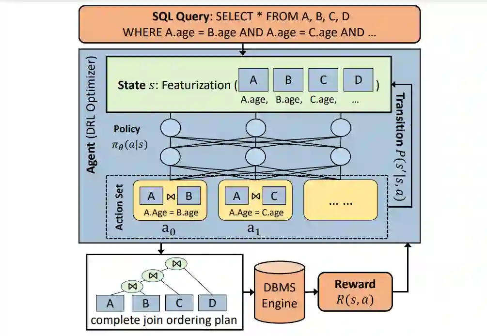 基于学习的算法也被用于数据处理和分析。经常使用的学习方法有两种:监督学习和强化学习。它们通过直接优化性能目标来实现更好的性能。监督学习通常需要一组丰富的高质量标注训练数据,这可能是很难和具有挑战性的获取。例如,配置调优对于优化数据库管理系统(DBMS)[8]的整体性能非常重要。在离散和连续的空间中,可能有数百个调谐旋钮相互关联。此外,不同的数据库实例、查询工作负载和硬件特性使得数据收集变得不可用,尤其是在云环境中。与监督学习相比,强化学习具有较好的性能,因为它采用了试错搜索,并且需要更少的训练样本来找到云数据库[9]的良好配置。另一个具体的例子是查询处理中的查询优化。数据库系统优化器的任务是为查询找到最佳的执行计划,以降低查询成本。传统的优化器通常枚举许多候选计划,并使用成本模型来找到成本最小的计划。优化过程可能是缓慢且不准确的[10]。在不依赖于不准确的成本模型的情况下,深度强化学习(DRL)方法通过与数据库[11]、[12]交互来改进执行计划(例如,更改表连接顺序)。图1提供了使用DRL进行查询优化的典型工作流。当查询发送给代理(即DRL优化器)时,代理通过对基本信息(如访问的关系和表)进行特征化,生成状态向量。agent以状态为输入,利用神经网络生成一个动作集的概率分布,动作集可以包含所有可能的作为潜在动作的join操作。每个操作表示一对表上的部分连接计划,一旦执行操作,状态将被更新。在采取可能的行动之后,生成一个完整的计划,然后由DBMS执行该计划以获得奖励。在这个查询优化问题中,奖励可以根据实际延迟计算。在有奖励信号的训练过程中,agent可以改进策略,产生更高奖励的更好的连接排序(即延迟更少)。