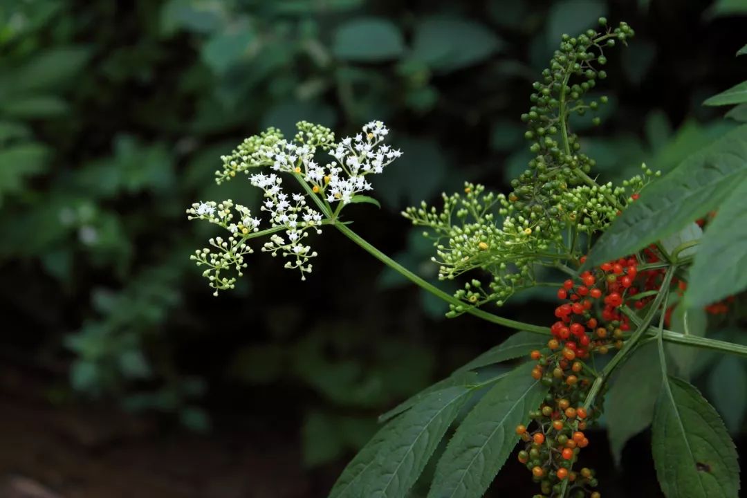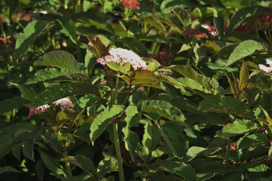 在接骨木属中,还有种与接骨木非常相似的植物。它就是我们常见的接骨草S. chinensis,从其学名的种加词chinensis可以看出,它原产自中国。在《本草纲目》中,它又被称为“陆英”。与接骨木的最大区别是,它是草本植物没有木质茎,因而被称作接骨草。此外,接骨草还有个独特的特点,在顶生的复伞形花序中,杂生着黄色倒杯状的不孕性花(蜜腺杯),它的作用是为可孕花招蜂引蝶。到了八九月间,接骨草的果实陆续成熟,由青转橙、由橙变红。而那些小小的蜜腺杯则从黄色变成暗绿色,低调地映衬着红宝石般的果实。