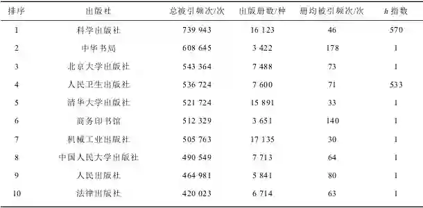注:①因有10个出版社的出版册数及册均被引频次数据缺失,表中以“—”表示,只显示总被引频次指与h指数;②计算册均被引频次指标时四舍五入取整数。