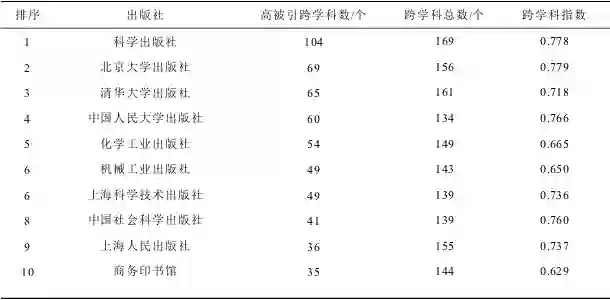 而且,在高被引跨学科出版社中,有21家出版社在至少21个学科被引中位居前10名(即高被引跨学科数至少为21),这些高被引跨学科出版社,既包括科技类综合性出版社和大学出版社,也包括社会科学领域的老牌知名出版社如中国社会科学出版社、商务印书馆与社会科学文献出版社等。