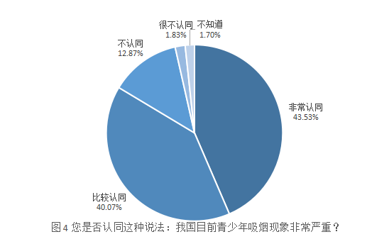 然而,大多数被访者同样认为“青少年吸烟现象比较严重”,其中“非常认同”的占比为43.53%,“比较认同”的占比为40.07%,合计超过80%,本次调查涉及国内多个代表性城市,该调查结果表明,我国青少年控烟行动刻不容缓。