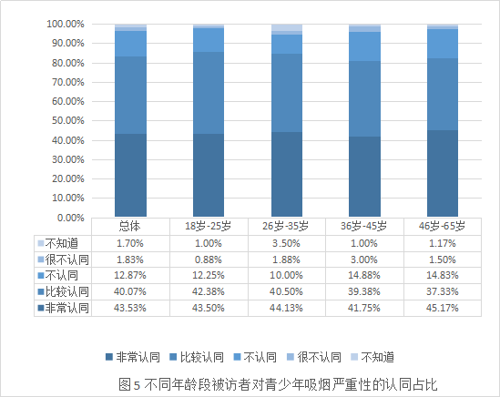 其中,“18岁-25岁”这个最接近青少年的年龄段的认同占比合计为85.88%,更切实表明了青少年吸烟现象的严重性,青少年控烟亟待进一步加强。