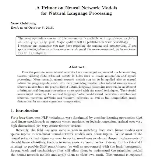 Manning 教授在他 CS224n 课上推荐的阅读材料之一。这位作者 Yoav 也是 NLP 大牛,自己也出过书「Neural Network Methods in Natural Language Processing」。