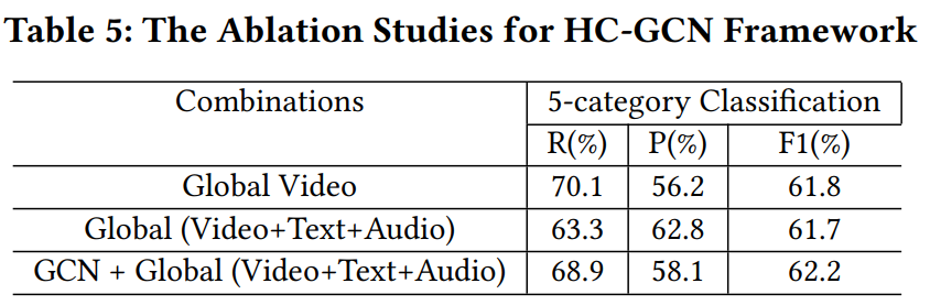 同时,为了进一步检验我们模型图网络建模部分的有效性,我们做了如下对比实验,包括仅用视频(Global Video)和仅利用多模态信息(Global(Video+Text+Audio))进行社交关系分类,实验结果如下表所示。