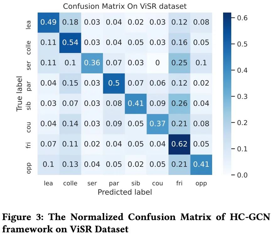 从实验结果中可以发现,我们的模型在敌对关系类别的Top1-准确率指标上并没有明显优势,这可能是因为敌对关系中的角色在电影中没有太多的互动和交流,从而影响了模型性能。相反,我们的方法在亲密的关系中表现得很好,例如,Colleague,Service,Parent-offs,Sibling,Couple和Friend。此外,我们在ViSR数据集上的实验混淆矩阵表明,模型可能会在亲密关系(如Friend、Sibling和Couple)之间判断出错。这是因为属于这些社交关系的角色在他们的活动和对话中往往有相似之处。