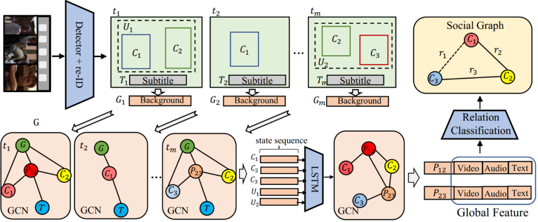 为此,我们提出基于图卷积网络的视频人物社交关系图生成方法,具体来说,我们首先整合了短期的多模态线索,包括视觉、文本和音频信息,通过图卷积技术为人物生成帧级子图。在处理视频级的聚合任务时,我们设计了一个端到端的框架,沿着时间轨迹聚合所有的帧级子图,形成一个全局的视频级人物社交关系图,其中包括多角色之间的各种社交关系。