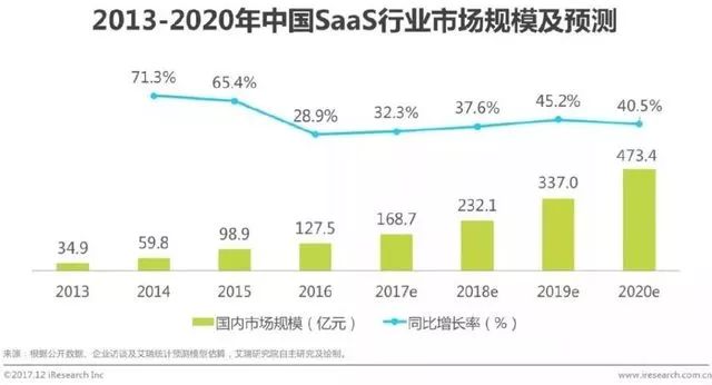 根据艾瑞咨询发布的报告显示,国内SaaS市场在2014-2015年经历了短暂的爆发式增长,增速分别高达71.3%和65.4%。从2016年开始,SaaS市场进入相对理性平稳的发展阶段,将保持30%-40%的按年增长率。预计2020年国内SaaS市场规模将达到473.4亿元,未来发展空间十分广阔。