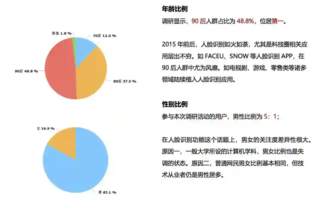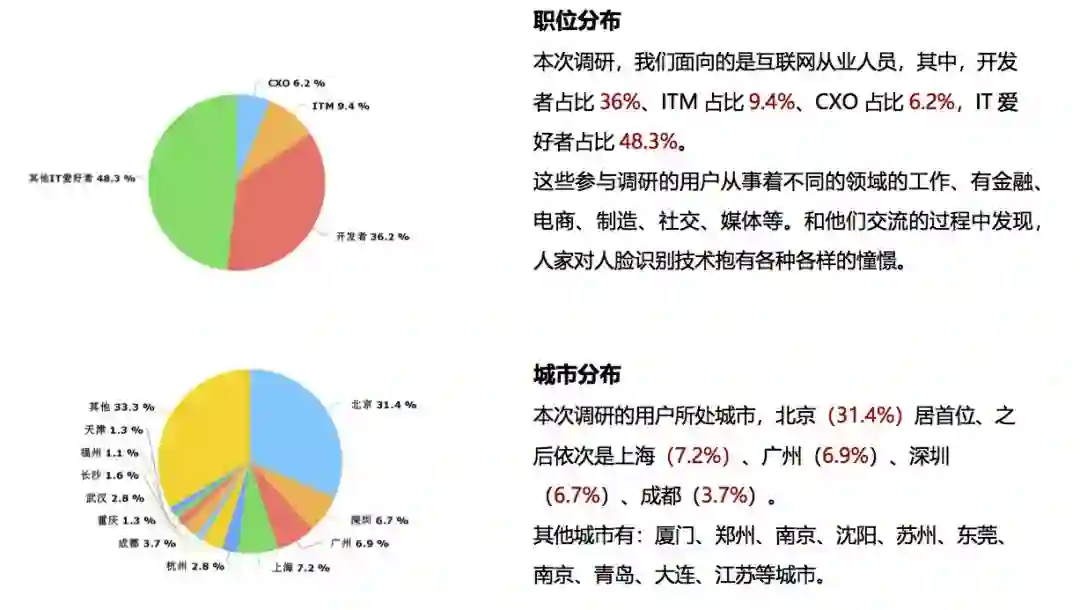 为了帮助大家了解互联网从业人员对人脸识别技术的认知度,进而分析人群比例、城市分布、使用场景等规律,为今后人脸识别功能的用户体验设计优化做基石。