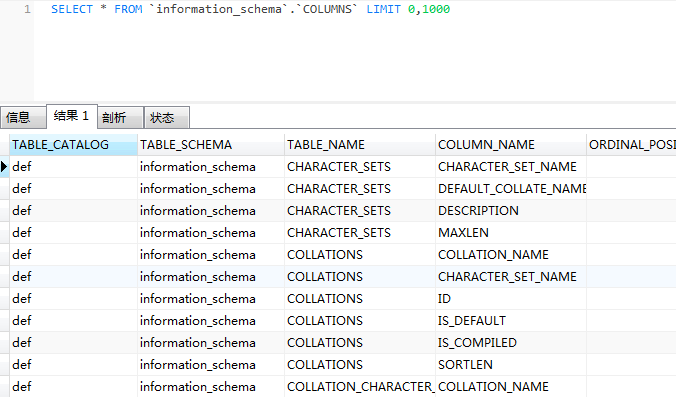 COLUMNS表存储着数据库的库名、表名和字段名。对应的字段为TABLE_SCHEMA、TABLE_NAME、COLUMN_NAME。