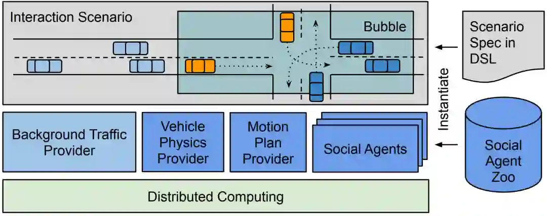 上图是SMARTS 模型架构,其交互方案是使用特定领域语言(DSL)定义的。Social智能体是从“ Social智能体Zoo”中实例化而来。橙色车辆由学智能体控制、深蓝色车辆由 Social智能体控制、浅蓝色车辆由交通服务提供商控制。