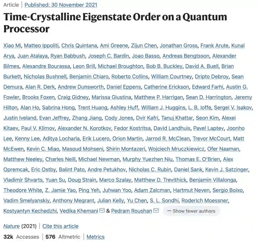 2021年11月30日,谷歌量子AI的研究人员利用Sycamore量子计算机创造出的时间晶体登上《Nature》。