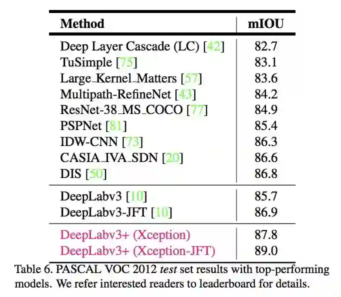 另外使用 depthwise separable convolution,使用 Pretraining on COCO 和 Pretraining on JFT,在这些 tricks 辅助下,PASCAL VOC 2012 test set 达到惊人的 89.0%,取得新的 state-of-the-art 水平。