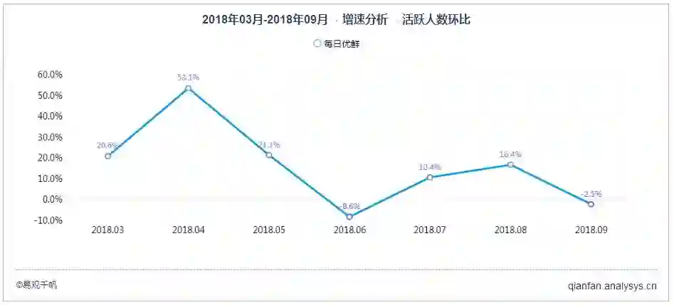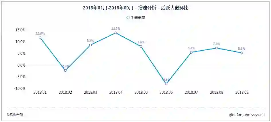 9月,秋日丰收季与大闸蟹吃蟹季来临,多款时令生鲜上市。生鲜电商持续稳定增长,月度活跃人数达到2018.9万,环比增速小幅回落至5.1%;与去年同期的月度活跃人数相比,同比增长66.1%。在月活增速逐渐放缓的背景下,生鲜电商重点发力社交模式、积极扩张门店,争抢线上线下流量;通过深耕会员体系维持用户黏性,完善生态系统。