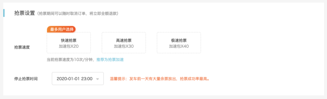 其中,车票开售时抢票是大部分用户最常遇到的情形。而在大量用户涌入时,决定能否抢到票的因素有两个——网速和手速,这也成为加速包的发力点。