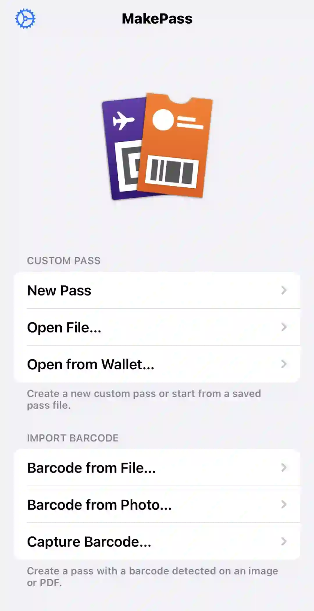 打开 iOS 的 MakePass App,映入眼帘的就是三个选项 New Pass、Open File 以及 Open From Wallet。这一点与 Pass2U 基本相似。