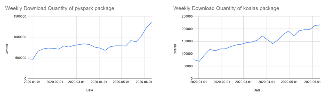经过一年多的开发,Koalas 实现了将近 80% 的 Pandas API。Koalas 在 PyPI 上的月下载量已迅速增长到 85 万,并以每两周发布一次的节奏快速演进。除了 Koalas,很多人仍在使用 PySpark API,该 API 也越来越受欢迎。