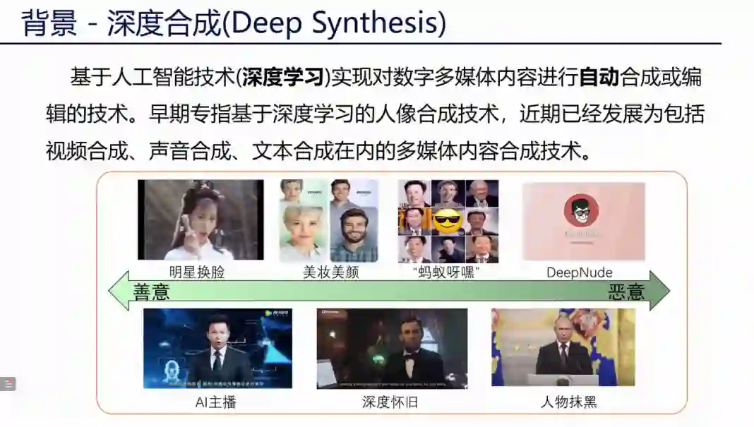 赫然老师结合多媒体技术的应用和社会影响,阐述了多媒体技术在影视娱乐、国家安全领域的意义和影响,并对多媒体数据合成、鉴别技术的挑战和进展进行了详细的介绍。