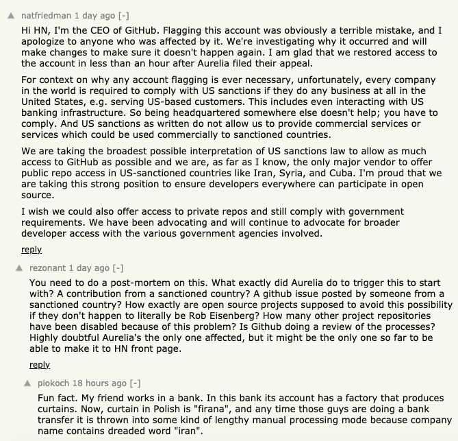 随后,在开发者不断的质疑声中,GitHub CEO Nat Friedman 在 Hacker News 上进行了回应并道歉。Friedman 这样说道:「关闭这个账户显然是一个可怕的错误,我向所有受到影响的人们道歉。我们正在调查此事发生的原因,并将做出改变以确保此类事件不再发生。我很庆幸的是,在 Aurelia 申诉不到一个小时的时间内,我们就恢复了对它的访问。」