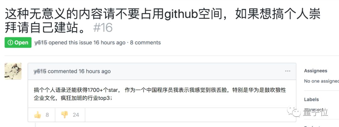 不过,GitHub作为一个源代码托管平台,虽然偶尔也有像996.icu、女装大佬合辑、杭州买房指南这种非代码项目,不过大抵是和程序员群体的日常工作生活相关的,而这份任正非语录,在被程序员们纷纷标星之余,也在issues和微博上引发了一些争议。