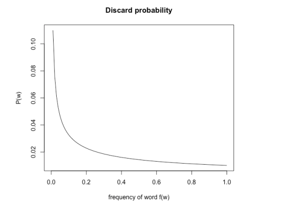 在训练阶段,只有当从(0,1)的均匀分布中随机抽取一个值的大小大于单词被丢弃的概率时,该单词才会被丢弃。下面是在默认阈值情况下,单词被丢弃概率与词频f(w)的关系。如图所示,随着单词频率的增加,被抽到的概率大于被丢弃的概率P(w)的概率增加。因此,随着单词频率的增加,被丢弃的概率也增加。注意这只适用于无监督模型,在有监督模型中,单词不会被丢弃。
