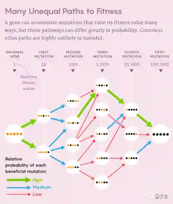 而要积累这五个单核苷酸突变,可能的路径有120条。但是走哪一条路径的概率是不同的。
