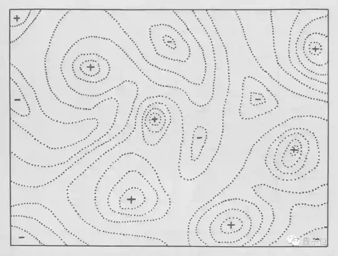 如果某种变体对环境的适应度越高,就会在地形图上形成一个“山峰”,在下面的平面图中用“+”表示;适应度越低,则会形成一个“山谷”,用“-”表示。