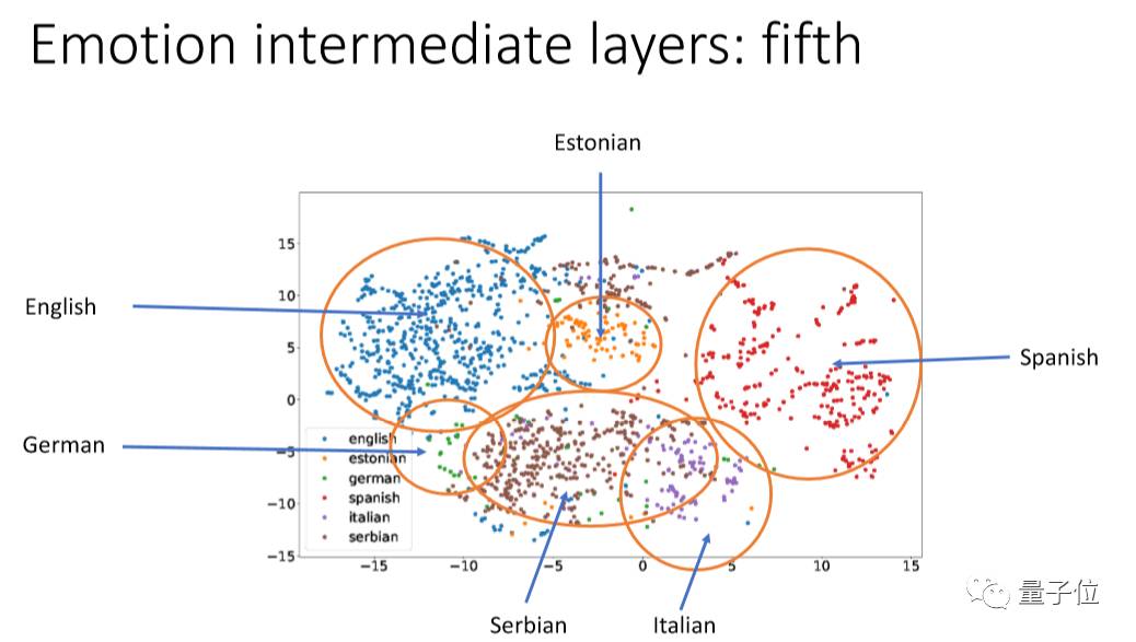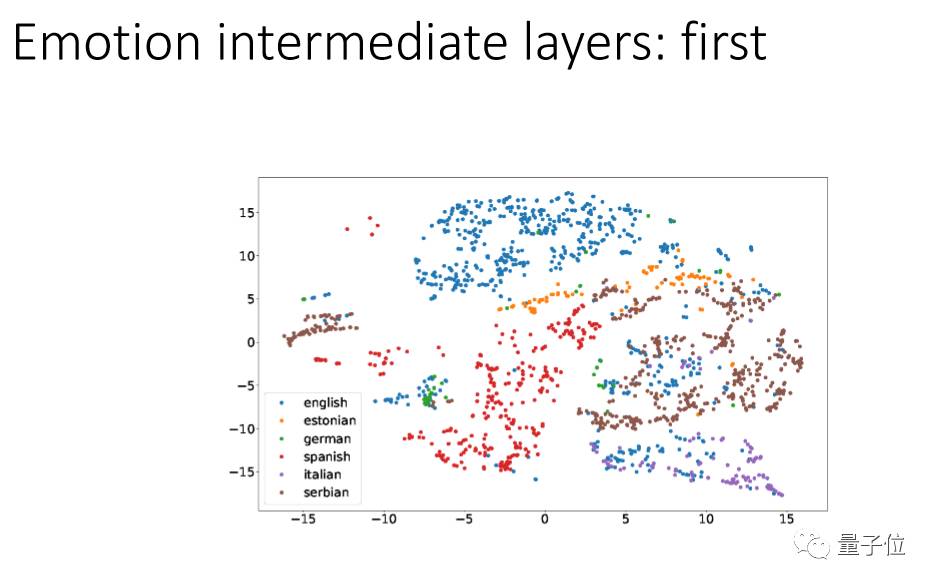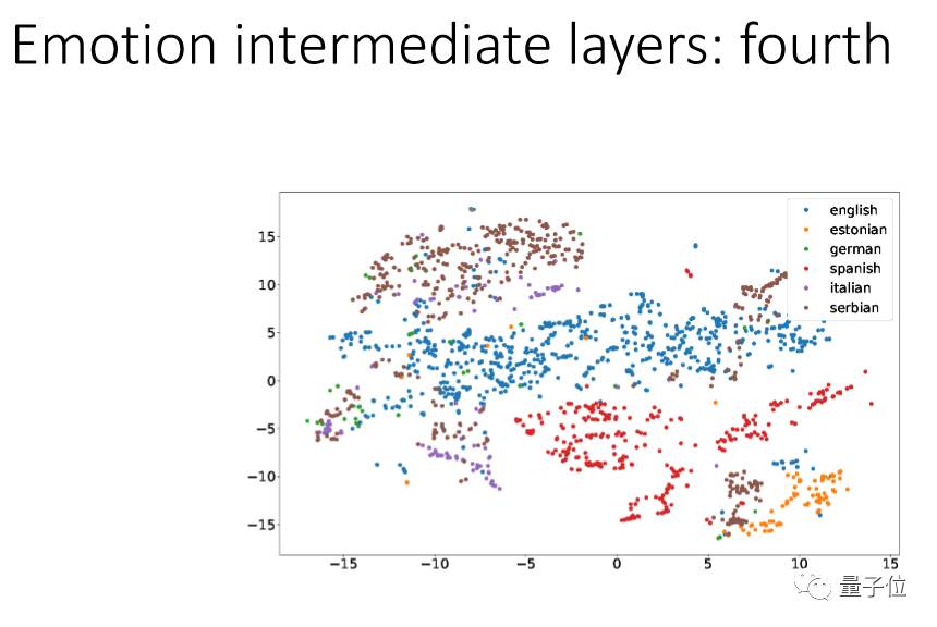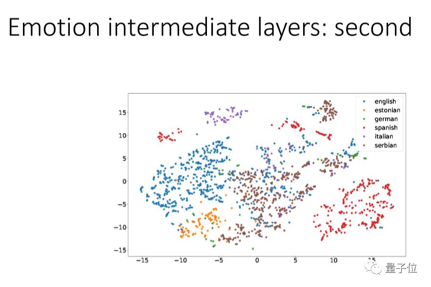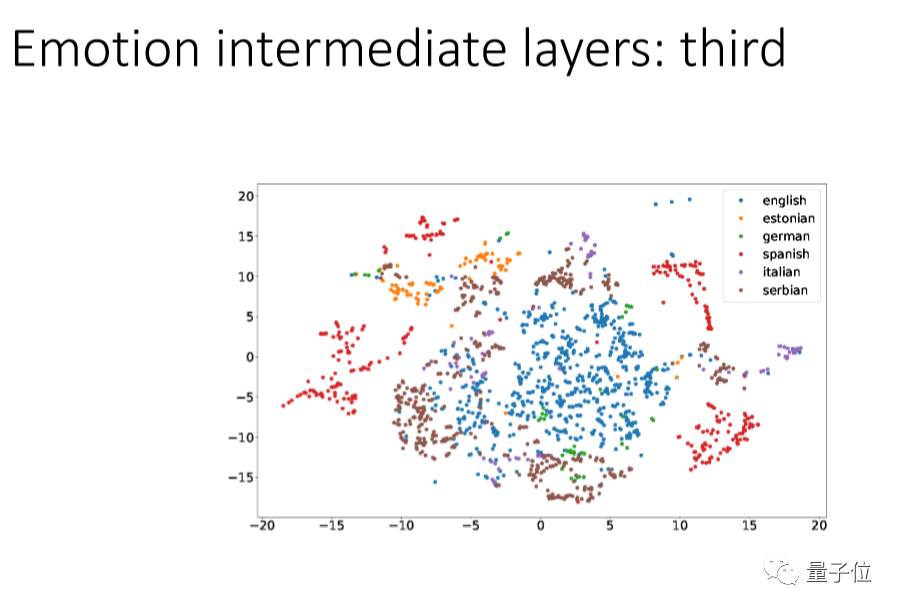 这个结果想告诉大家:在情感识别上,第一层如果用很多种语言来训练它,这种方式是好的,越到上层语言会分离。