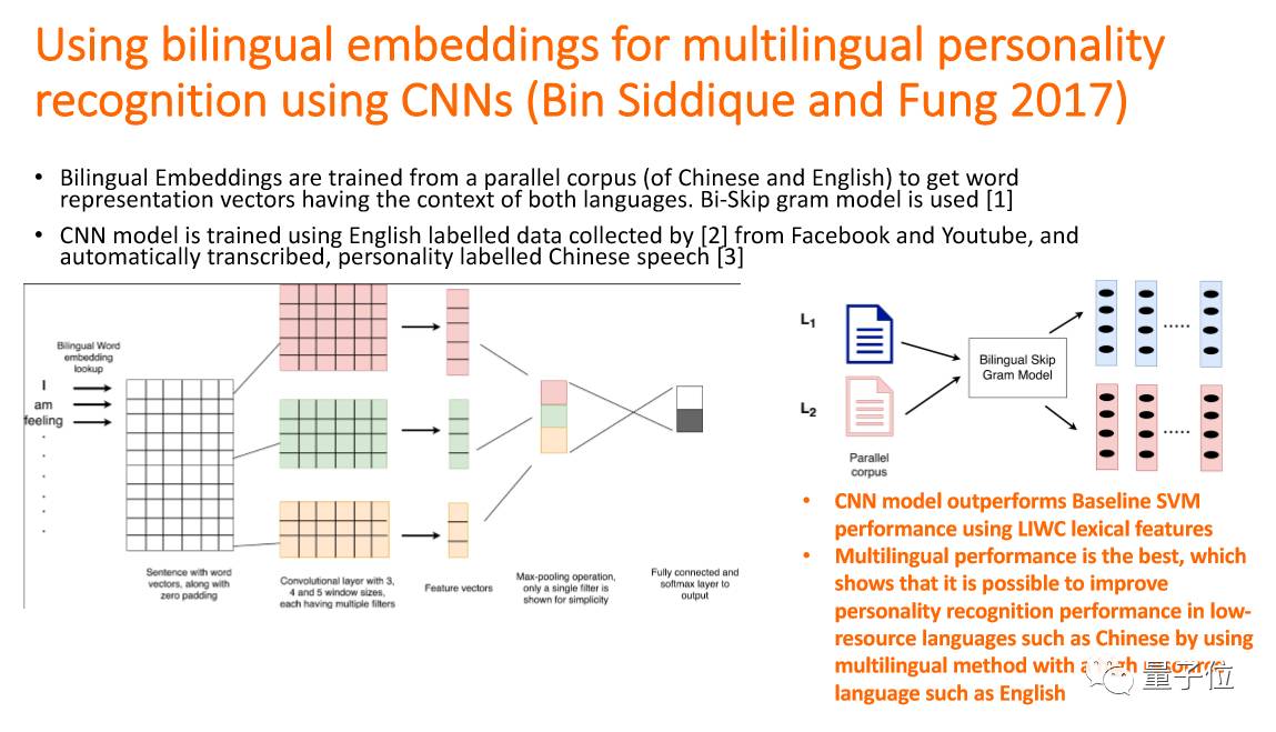 我们能不能用同一个系统去识别?说不同种语言的人他们的性格,直觉上好像不太一样,但是实验之后我们提出一个方法:bilingual word embedding,不论哪种语言,能够识别出一样的意思,那我们就发现可以有一个系统能够通过不同种的语言去分析性格。