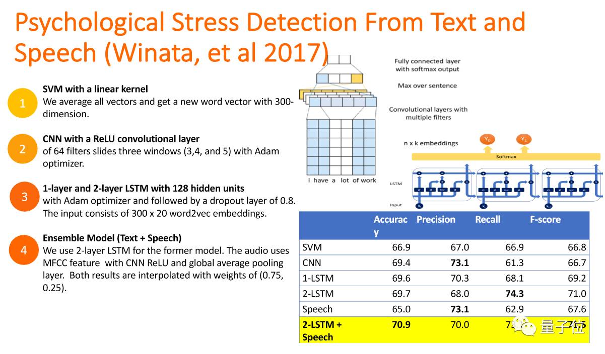 然后这个是心理相关,分辨出人的心理问题。从email、Facebook等一些文本,还有通过聊天的过程来辨别这样的问题。结果就是:需要明白语言的意思,和这段音频的状态。这两点比听懂说什么更加重要。