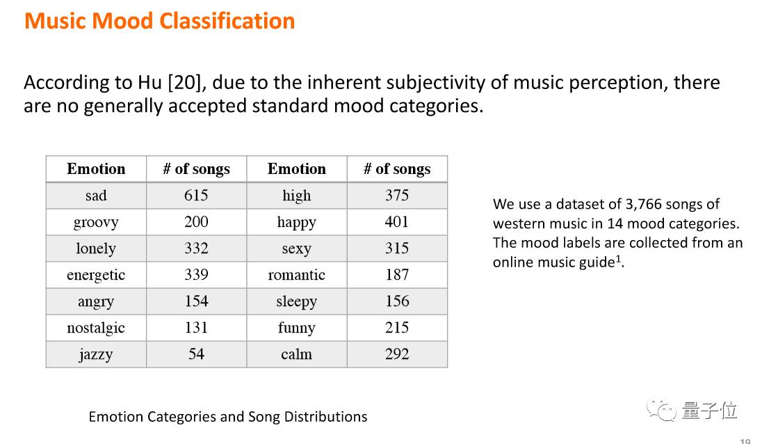 首先想说一下对音乐的分析。之所以做音乐,是因为音乐本身就是表达情感的。下图的横轴是valence,表示人的高兴程度;竖轴arousal表示人的激动程度。音乐和人的情感是同一个plan。所以我们在做音乐分析的时候,想看能不能用机器学习的方法,直接把音乐的风格区分开。